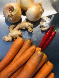 Verhit olijfolie in een soeppan en stoof de ui, knoflook, wortel, gember, rode chilipeper aan. Kruid met zwarte peper van de molen, zeezout, korianderpoeder, ras al hanout en komijnpoeder. Zet onder met bouillon en laat pruttelen op het vuur tot de wortel gaar is. Mix met de staafmixer en passeer door een fijne zeef.